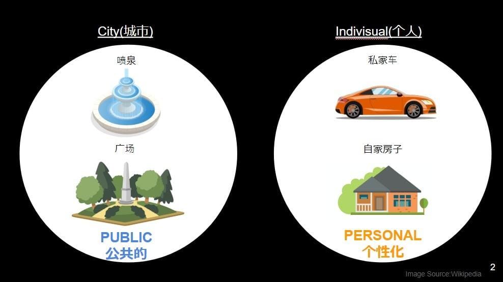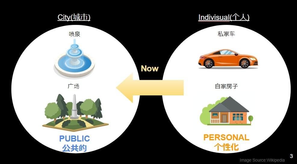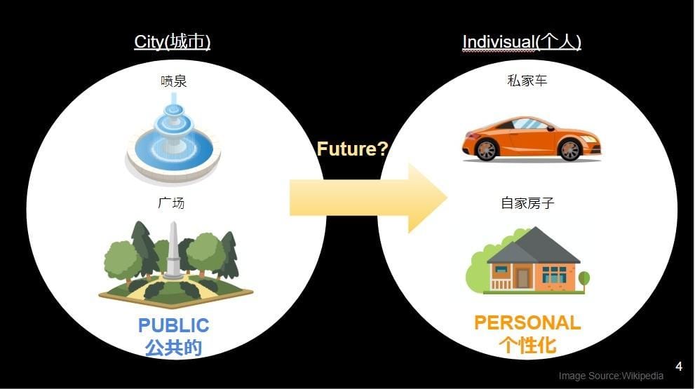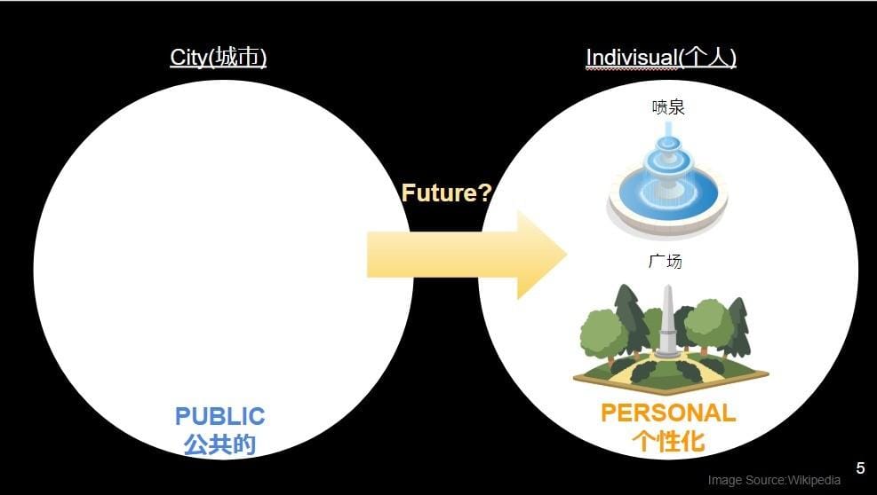 これまで都市では、都市のパブリックなもの、つまり、噴水、信号、広場などと、パーソナルなもの、つまり、スマートフォン、車、家などとは、完全にわかれていた。