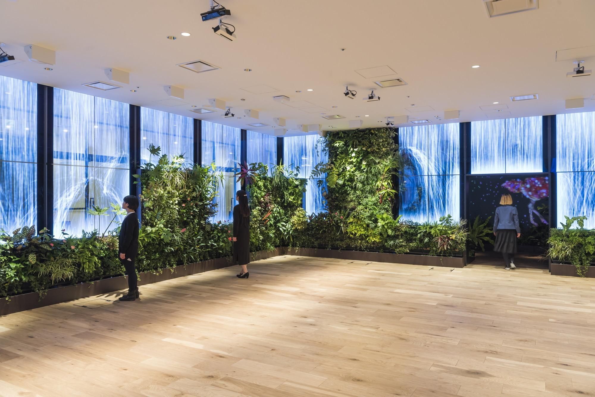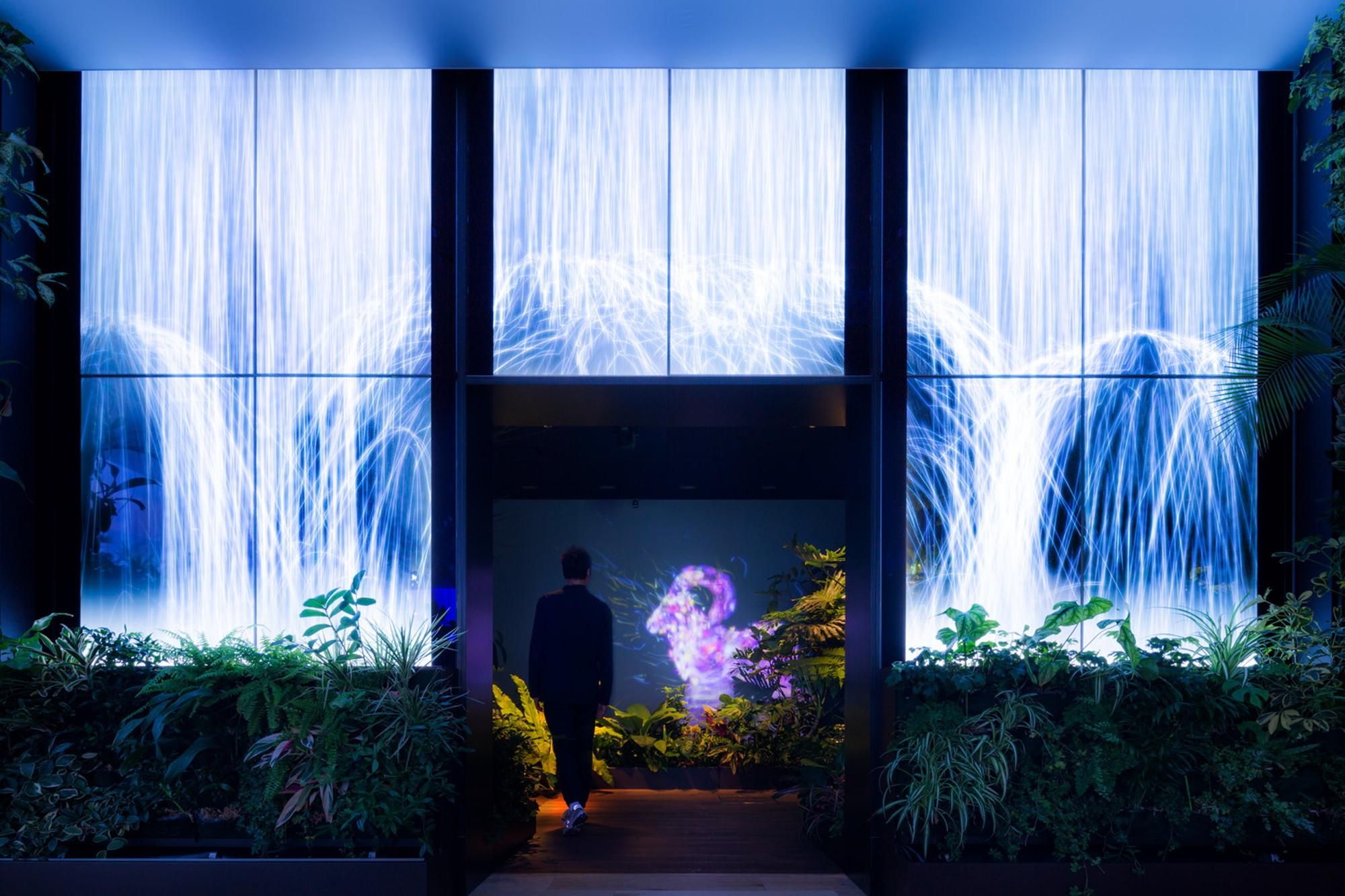 エントランスの滝は、映像ではなく、プログラムで動く二度と同じ状況がない映像です。この映像の滝は、普段はエントランスとその他のスペースとの目隠しの役割をしています。
